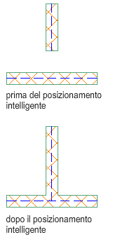 Di seguito è illustrata la creazione di un giunto a T con due segmenti di muro mediante il posizionamento intelligente.