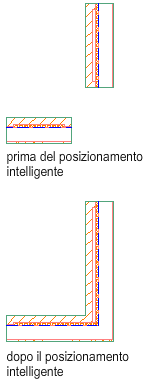 Consente di utilizzare la funzione di posizionamento intelligente per posizionare le intersezioni dei muri. I segmenti di muro non collineari vengono tagliati o estesi in modo da generare angoli corretti. Selezionare i segmenti di muro e specificare un metodo di posizionamento. In generale, quando si seleziona un contorno, viene creata una condizione di posizionamento a T. Se non è selezionato alcun contorno, viene creata una condizione di posizionamento a L.