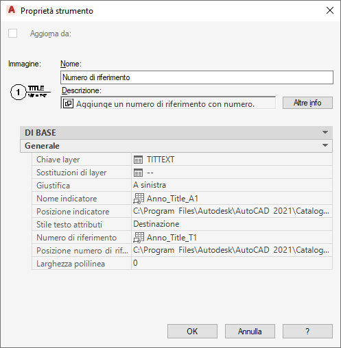 | Indicatore | Generale | È possibile selezionare nell'elenco il blocco usato per il simbolo del numero di riferimento. |