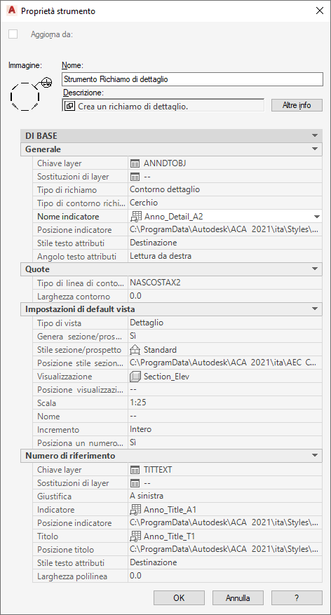 | Nome | Generale | Imposta il nome di default per le viste dello spazio modello create con questo strumento. È possibile sostituire il nome impostato nello strumento durante l'inserimento del richiamo nel disegno. |