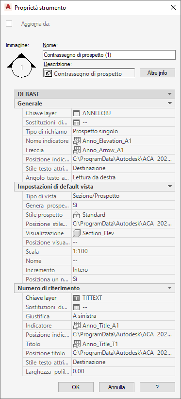 | Freccia | Sezione/ Prospetto | Definisce il blocco per la freccia del contrassegno di sezione/prospetto. |