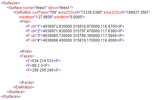 La maggior parte dei progetti di ingegneria civile e di rilevamento prevede la raccolta di informazioni di prospetto per la generazione delle curve di livello della superficie, che rappresentano un modello della superficie del terreno. Le superfici in LandXML sono formate da numerose facce che possono essere di tipo TIN (Triangular Irregulated Networks) o quadrilateri. Generalmente i punti e le curve di livello sono componenti principali delle informazioni sulla superficie originale e sono integrati da linee di interruzione e contorni. È possibile creare una superficie in LandXML e importarla. Tale superficie viene convertita in un elemento massa di forma irregolare.