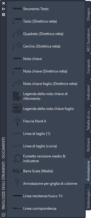 Gli strumenti Annotazione consentono di creare oggetti di annotazione a cui vengono applicate scale di annotazione specifiche. In Set di strumenti AutoCAD Architecture 2027 lo strumento Annotazione può essere personalizzato per aggiungere ai disegni i seguenti tipi di annotazioni:
