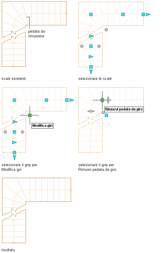 6. Al termine della rimozione delle pedate, è possibile fare clic sul grip Esci da Modifica giri per tornare alla modalità di modifica scala di default oppure fare clic con il pulsante destro del mouse e scegliere Deseleziona tutto per disattivare i grip.
