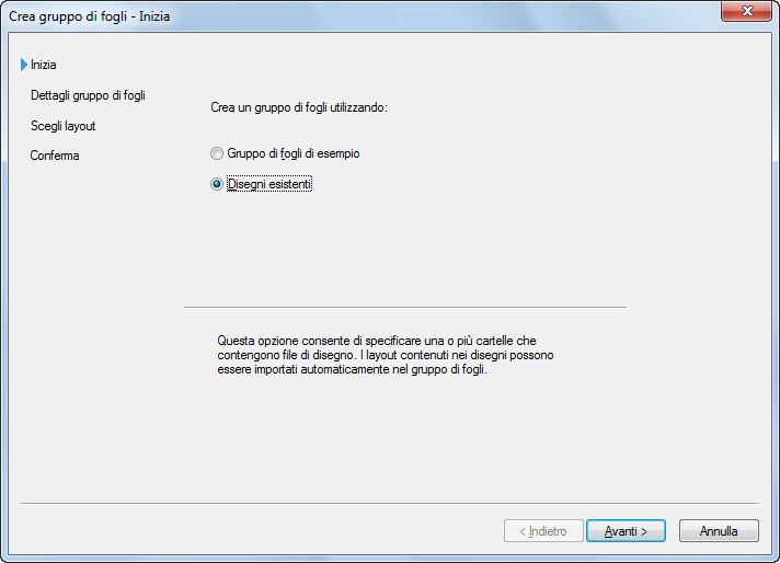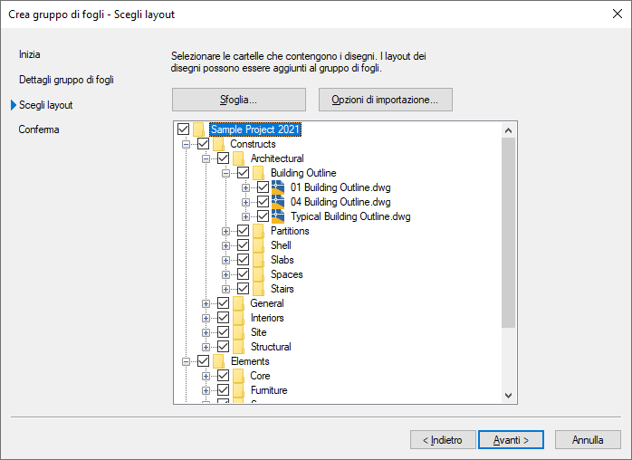 Nella finestra di dialogo Crea gruppo di fogli - Scegli layout è possibile selezionare layout dai disegni esistenti e aggiungerli al modello come fogli. Ad esempio, questa operazione può risultare utile per convertire fogli esistenti in fogli del progetto.