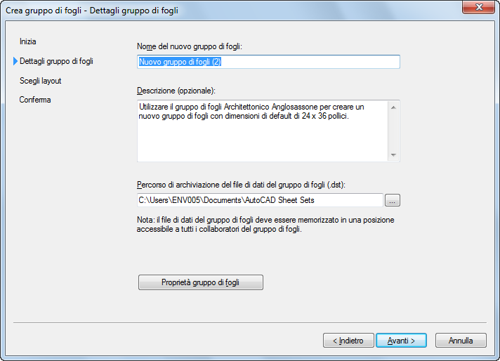 Viene visualizzata la procedura guidata Crea gruppo di fogli che fornisce istruzioni dettagliate su come creare un nuovo modello gruppo di fogli.