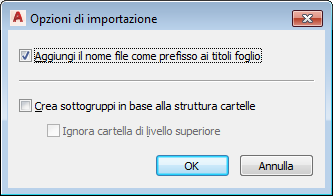 Per creare un modello di gruppo di fogli con i layout di uno o più disegni esistenti, attenersi alla procedura indicata di seguito. È inoltre possibile selezionare opzioni per aggiungere un prefisso ai titoli dei fogli che contenga il nome del file e per creare sottogruppi sulla base della struttura delle cartelle. Se si modificano i percorsi delle categorie principali nella finestra di dialogo Proprietà progetto del progetto contenente il gruppo di fogli, le impostazioni configurate per i gruppi di fogli vengono sostituite.