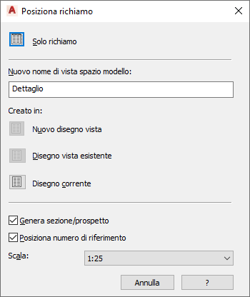 Per inserire un richiamo che crea un dettaglio nel disegno corrente della vista, attenersi alla procedura indicata di seguito.