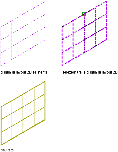 È possibile creare una griglia di pannello facciata continua basata su una griglia di layout 2D. Se in un disegno sono già presenti griglie di layout 2D, è possibile convertirle facilmente in pannelli facciata continua. Se invece si ha già esperienza nell'uso delle griglie di layout, risulta vantaggioso creare un pannello facciata continua e successivamente provare i comandi relativi alle facciate continue in modo da acquisire familiarità con gli stessi.