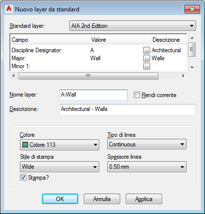 Per creare un layer conforme allo standard layer selezionato per il disegno, attenersi alla procedura indicata di seguito. Gli standard layer stabiliscono le convenzioni di denominazione per i nuovi layer in base alla struttura definita in tali standard. Set di strumenti AutoCAD Architecture 2027 crea layer come necessario secondo lo standard layer corrente. Ad esempio, quando si aggiunge un muro ad un disegno, tutti i layer muro necessari eventualmente mancanti vengono creati automaticamente.