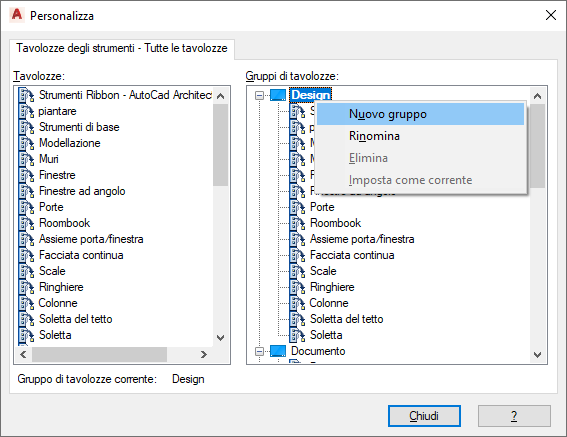 Suggerimento: La finestra di dialogo Personalizza può rivelarsi particolarmente utile per aggiungere tavolozze a gruppi di tavolozze di progetto.