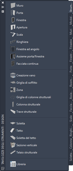 Le tavolozze degli strumenti costituiscono il metodo di accesso principale agli strumenti per la creazione di oggetti nel modello. È possibile disporre di strumenti per oggetti standard e per oggetti con determinati stili e proprietà. Queste tavolozze sono organizzate per gruppi in un insieme di tavolozze. Si possono creare tavolozze degli strumenti personalizzate oppure copiare quelle esistenti dalla Libreria.