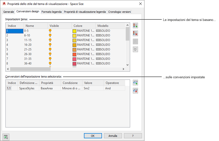 È possibile attivare un tema di visualizzazione in un disegno utilizzando uno strumento Tema di visualizzazione per aggiungere la legenda del tema al disegno o attivando una legenda esistente. La legenda indica i colori, i riempimenti e i tratteggi utilizzati per il tema.