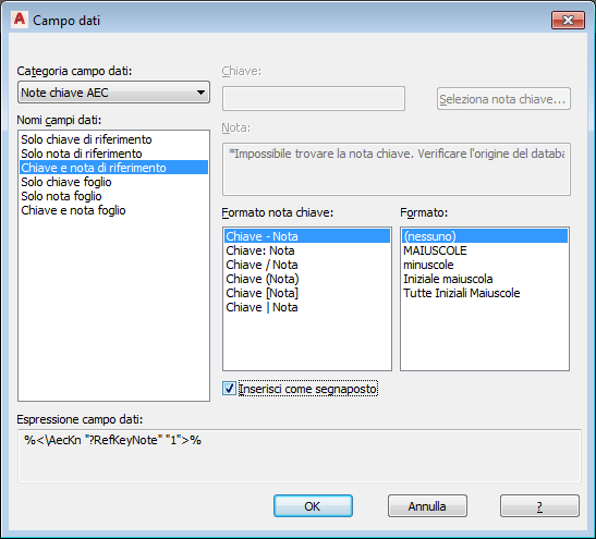- Nella finestra di dialogo Campo dati, verificare che la categoria di campo dati selezionata sia Note chiave AEC, quindi selezionare un formato per la nota chiave nell'elenco a discesa Nomi dei campi. Se è una delle opzioni chiave e nota è selezionata, è possibile selezionare un'opzione nel riquadro Formato nota chiave. Se lo si desidera, è anche possibile cambiare l'impostazione nel riquadro Formato.
