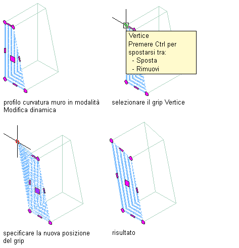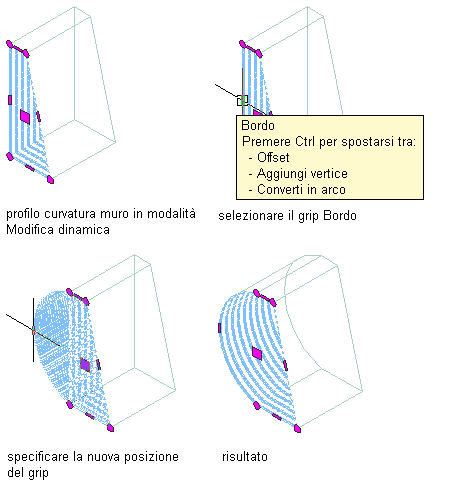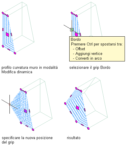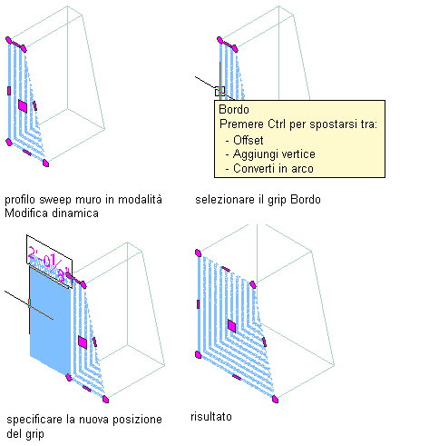| Aggiungere vertici al profilo | Selezionare un grip Bordo e premere CTRL per passare alla modalità di modifica Aggiungi vertice. Spostare il bordo nella posizione desiderata e fare clic oppure immettere un valore e premere INVIO. |