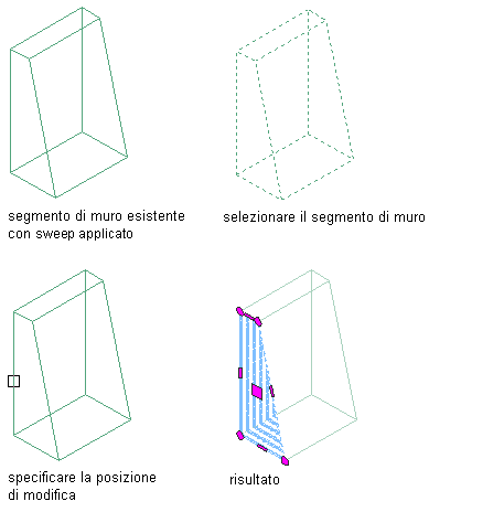 Per modificare la forma di un componente di muro definito con uno sweep muro, attenersi alla procedura indicata di seguito. Per modificare l'aspetto dello sweep, selezionare un altro profilo o modificare il profilo corrente.