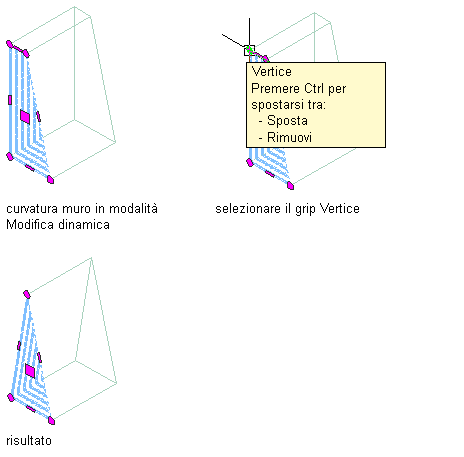 | Rimuovere vertici dal profilo | Selezionare il grip Vertice del vertice che si desidera rimuovere e premere CTRL per passare alla modalità di modifica Rimuovi. Spostare il cursore vicino al vertice selezionato e fare clic. |