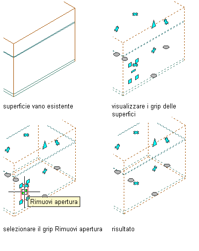 - Se è stato selezionato un vano di forma irregolare 3D, fare clic sul grip Modifica superfici e quindi selezionare il grip Modifica superfici della superficie in cui si trova l'apertura che si desidera rimuovere. Vengono visualizzati i grip delle aperture nella superficie.