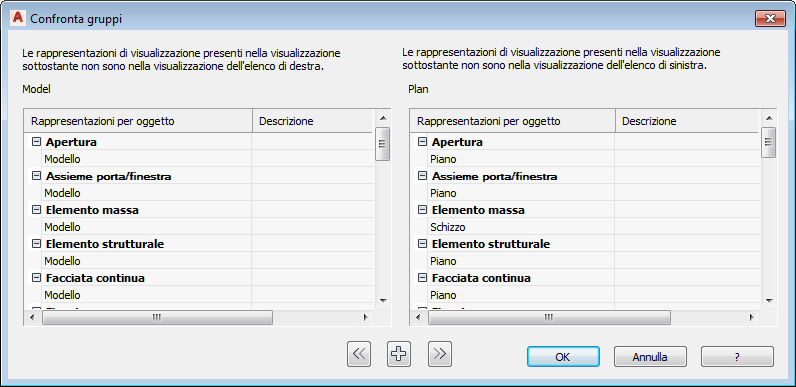 Nella finestra di dialogo Confronta gruppi vengono visualizzati due elenchi, ciascuno dei quali contiene le rappresentazioni assegnate ad una particolare visualizzazione, ma non a quella nella colonna adiacente.