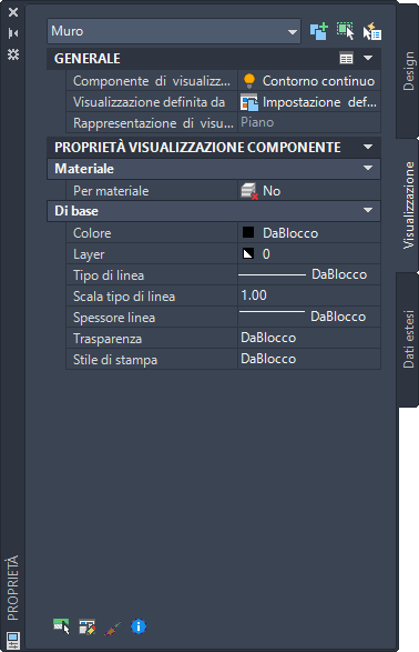 Mentre la scheda Design del riquadro Proprietà consente di gestire le proprietà fisiche di un oggetto, la scheda Visualizzazione consente di gestire le proprietà grafiche di un oggetto tramite la modifica delle impostazioni di singoli componenti di visualizzazione, ad esempio contorni e tratteggi. Le modifiche apportate in questa scheda vengono visualizzate immediatamente nella rappresentazione di visualizzazione attiva, ad esempio Piano o Modello, e possono essere anche applicate ad altre rappresentazioni di visualizzazione. Inoltre, mentre le impostazioni della scheda Design vengono applicate solo agli oggetti correntemente selezionati, nella scheda Visualizzazione è possibile specificare se si desidera che una modifica apportata ad una proprietà venga applicata al componente selezionato per tutti gli oggetti dello stesso tipo, tutti gli oggetti dello stesso stile o solo per l'oggetto selezionato. Se il componente di visualizzazione è controllato dal materiale, le modifiche verranno applicate a tutti gli oggetti che utilizzano tale materiale.