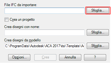 - Nella finestra di dialogo Importa file IFC e crea disegni, in File IFC da importare, fare clic su Sfoglia.