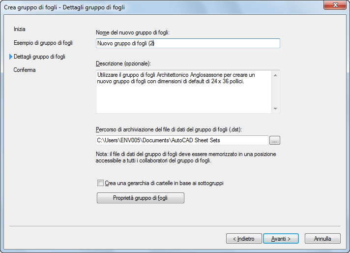 Viene visualizzata la procedura guidata Crea gruppo di fogli, che fornisce istruzioni dettagliate su come creare un nuovo modello di gruppo di fogli.