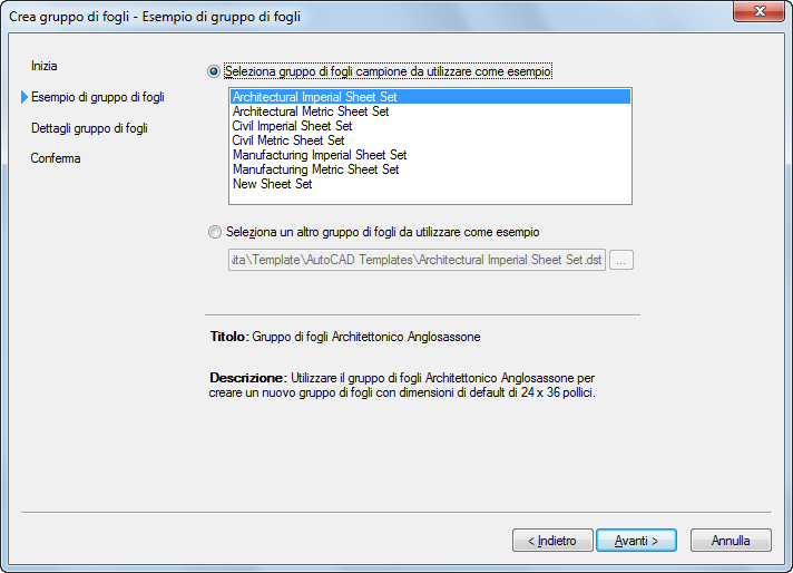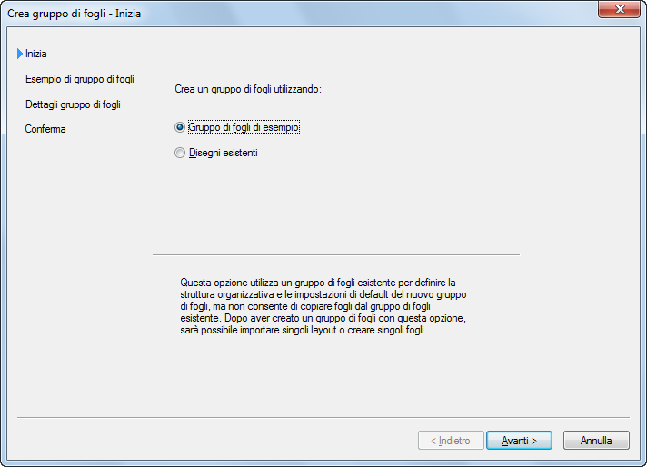 | Utilizzare un gruppo di fogli di esempio dall'elenco | Selezionare l'opzione Seleziona gruppo di fogli campione da utilizzare come esempio, selezionare un gruppo di fogli dall'elenco e fare clic su Avanti. |