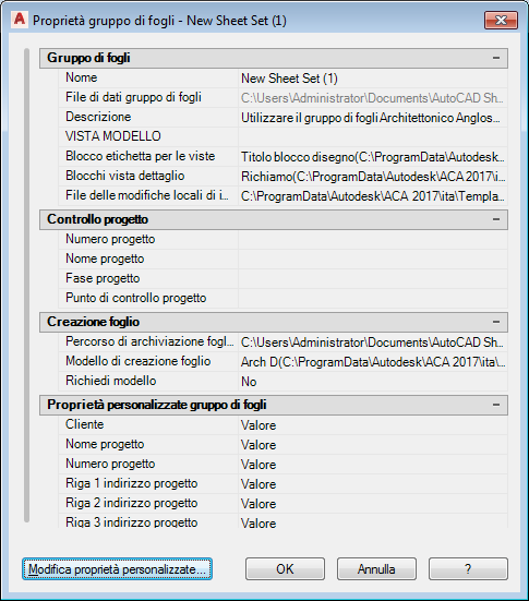 Per ulteriori informazioni sulle proprietà personalizzate, vedere Inclusione di informazioni in fogli e gruppi di fogli nella Guida in linea di AutoCAD.
