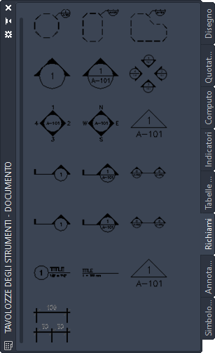 Le piante, le sezioni, i prospetti e i dettagli fanno tipicamente riferimento ad un richiamo. In Set di strumenti AutoCAD Architecture 2027 sono disponibili numerosi strumenti Richiamo predefiniti per i vari tipi di vista. È anche possibile inserire richiami per i quali non vi sono riferimenti in una vista e creare i riferimenti in un momento successivo.