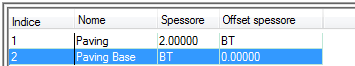Se ad esempio si desidera creare uno stile in cui un componente pavimentazione da 2" viene posizionato direttamente sopra una base di pavimentazione di spessore variabile, il cui bordo inferiore coincide con la linea di base della soletta, i valori di Spessore e Offset spessore andranno specificati nel modo seguente: