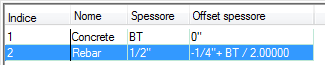 Se tuttavia si desidera posizionare l'armatura al centro del componente calcestruzzo (indipendentemente dallo spessore del calcestruzzo), è possibile configurare i componenti nel modo seguente. Lo spessore del calcestruzzo viene specificato come variabile (BT), mentre l'offset del componente armatura viene specificato come la metà dello spessore del calcestruzzo (quale che esso sia) meno la metà dello spessore dell'armatura (1/4").