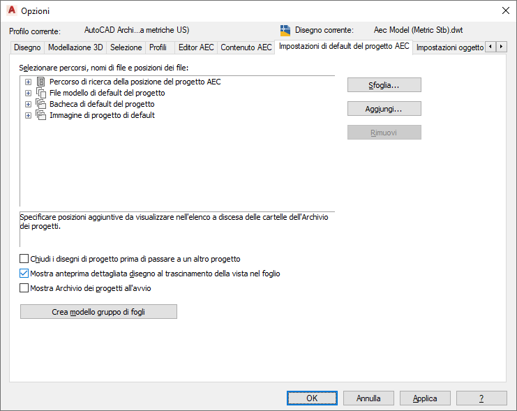 Per impostare le opzioni di default dei progetti Set di strumenti AutoCAD Architecture 2027, attenersi a questa procedura. Di seguito vengono riportate le opzioni che è possibile impostare nei progetti: