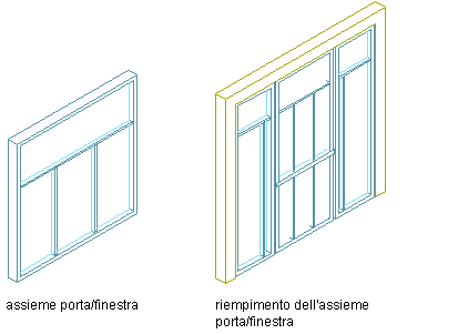 Gli assiemi di finestra svolgono una funzione simile ai pannelli facciata continua, ma oltre ai riempimenti pannello possono contenere oggetti quali porte o finestre. Gli assiemi porta/finestra possono essere inseriti nelle facciate continue e nei muri standard.
