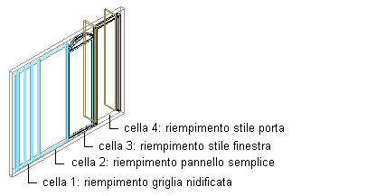 È possibile creare nuove definizioni di elemento e assegnarle nella facciata continua. Ad esempio, è possibile creare più definizioni di riempimento e assegnare riempimenti diversi a celle specifiche della griglia.