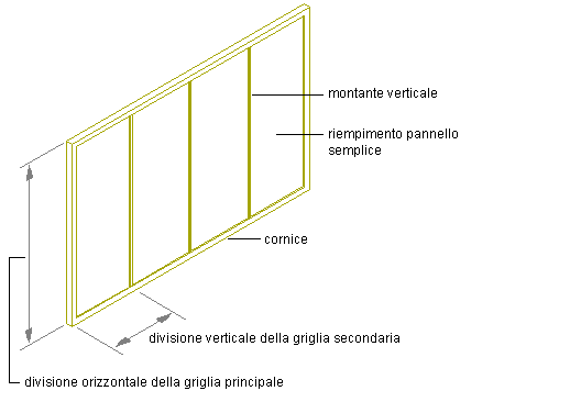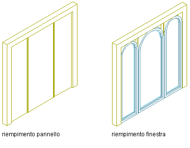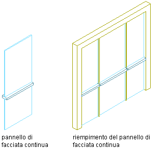 Tra gli altri oggetti che è possibile inserire in una griglia vi sono i pannelli facciata continua e gli assiemi porta/finestra. I pannelli facciata continua vengono utilizzati per rappresentare elementi complessi che si ripetono nell'ambito della facciata continua principale.