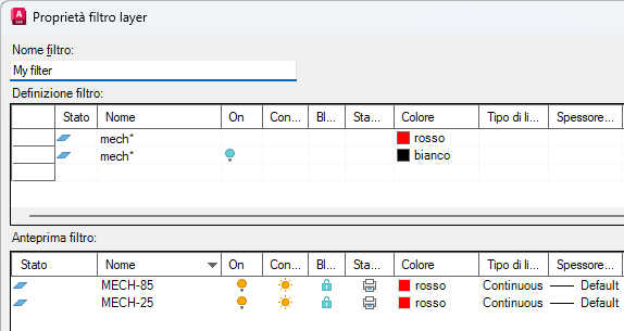 In questo esempio, il filtro proprietà layer include i layer che iniziano con "mecc" e sono di colore rosso o i layer che iniziano con "mecc", sono disattivati e di colore bianco.