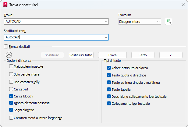 L'impostazione Trova in controlla se la ricerca e la sostituzione del testo devono essere eseguite nell'intero disegno o testo nell'oggetto o negli oggetti correntemente selezionati.
