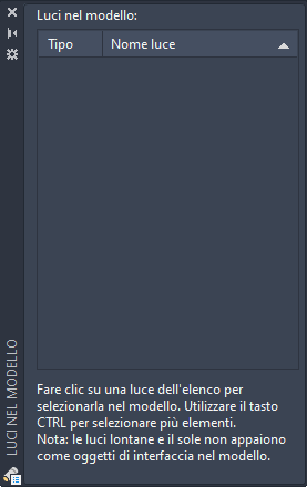 Un'icona nella colonna Tipo indica il tipo di luce: puntiforme, riflettore o luce distante e se è attivata o disattivata. Selezionare una luce dall'elenco per selezionarla nel disegno. Per ordinare l'elenco, fare clic sull'intestazione di colonna Tipo o Nome.