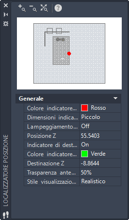 Per default, questa finestra viene visualizzata automaticamente durante un attraversamento o un volo 3D. Modificare le impostazioni o trascinare gli indicatori in questa finestra per riposizionare il punto di vista nell'area di disegno.