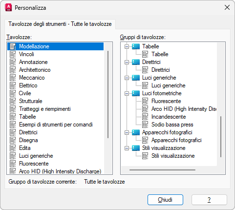 Nella finestra Tavolozze degli strumenti vengono visualizzate tutte le tavolozze degli strumenti disponibili ed è possibile creare e gestire gruppi di tavolozze degli strumenti.