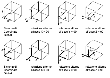 È possibile definire qualsiasi sistema UCS specificando un'origine e una o più rotazioni attorno agli assi X, Y e Z.