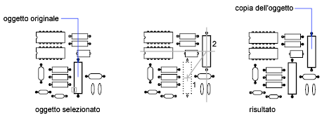 Copiare un oggetto utilizzando la distanza e la direzione specificate da un punto base seguito da un secondo punto. In questo esempio viene copiato il blocco che rappresenta un componente elettronico. Selezionare l'oggetto originale da copiare. Specificare il punto base per lo spostamento (1) seguito da un secondo punto (2). L'oggetto viene spostato della distanza e nella direzione dal punto 1 al punto 2.