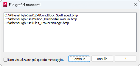 Questa finestra di dialogo viene visualizzata quando si esegue il rendering di una scena con mappe di composizione il cui percorso non è più corrente. Ciò può verificarsi se le mappe di composizione sono state spostate o eliminate o se il file di disegno è stato spostato in un computer con un differente mappaggio di unità.