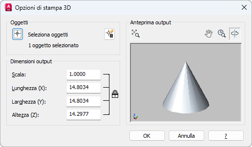 Specifica le impostazioni di stampa 3D e prepara il disegno per la stampa 3D.