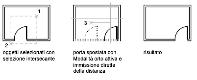 Un esempio pratico è lo spostamento di una porta in un muro. La porta nell'illustrazione è inserita completamente in una selezione Interseca, mentre le linee del muro si trovano solo in parte nell'area di selezione Interseca.