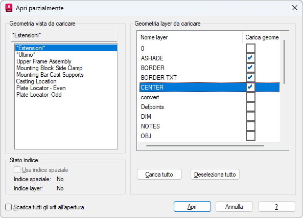anche quando un disegno è aperto parzialmente, nel file vengono caricati sia gli oggetti con nome sia la geometria specificata dai layer selezionati. Nel disegno parzialmente aperto sono disponibili tutti i layer, ma viene visualizzata solo la geometria appartenente ai layer specificati.