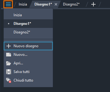 Utilizzare il menu della scheda di file per visualizzare un elenco di disegni aperti, passare da un disegno all'altro, salvare tutti i disegni, chiudere tutti i disegni e altro ancora.