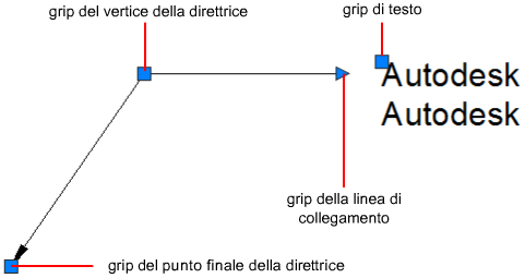 È possibile apportare più modifiche direttrice direttamente mediante i grip multifunzione. È possibile aggiungere e rimuovere direttrici, aggiungere e rimuovere vertici, allungare o spostare la linea di collegamento oppure spostare il testo della direttrice.