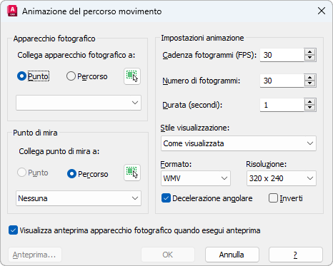 Specifica le impostazioni per l'animazione di un percorso di movimento e crea un file di animazione.