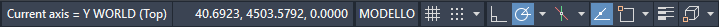 L'icona UCS con le linee d'asse di RTUCS e la riga di stato con le informazioni sull'asse corrente: